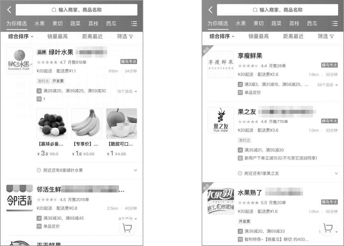 图2-29 “饿了么”App中“生鲜果蔬”版块的部分店铺的相关界面