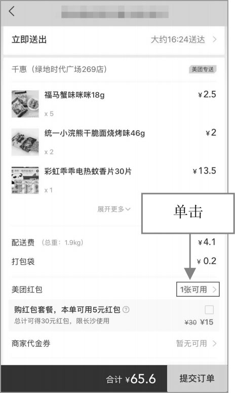 步骤04 执行操作后,进入订单界面。可以看到,此时在该界面中显示“合计65.6元”,而“美团红包”一项则显示“1张可用”。此时需要做的就是单击“1张可用”所在的位置,如图2-24所示。