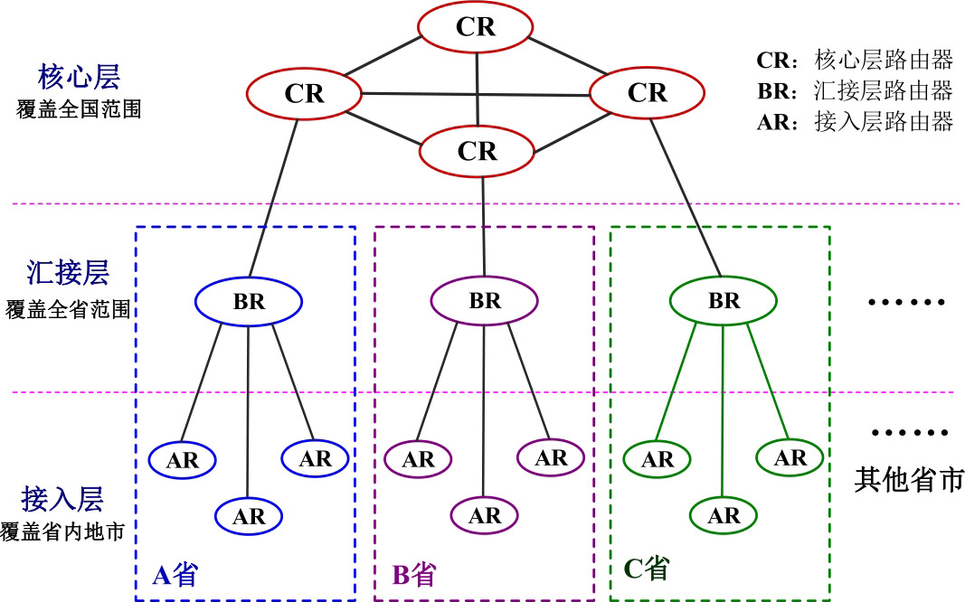 以运营商的IP承载网为例,为了实现全国覆盖,IP承载网呈现了典型的树状结构,从“枝—接入层”(实现区县级别的覆盖),到“干—汇接层”(汇接省内所有地市级网络),再到“根—核心层”(汇接国内所有省级网络),如图3-4所示。IP承载网中的每一层都包含了许多IP路由器,同层的路由器先组成一个覆盖地市的小网,再由上一层路由器进行汇聚并实现全省的覆盖和互联互通,最终由省际路由器实现全国汇聚和联接。如IP承载网一样,各类功能池通过多层集结来实现信息资源和处理能力的四通八达。