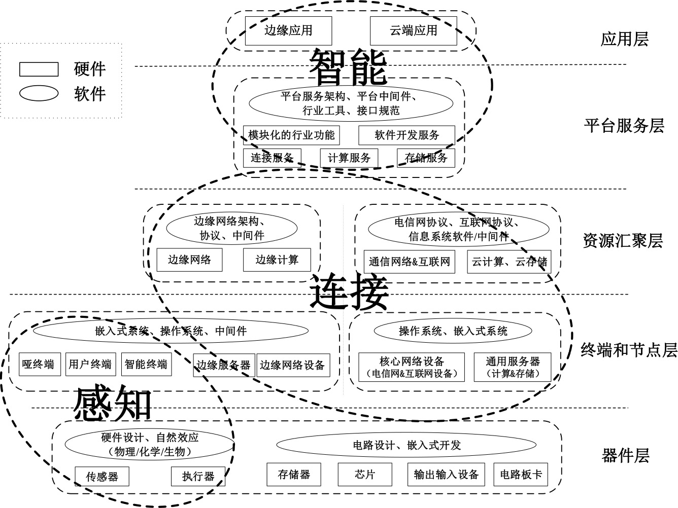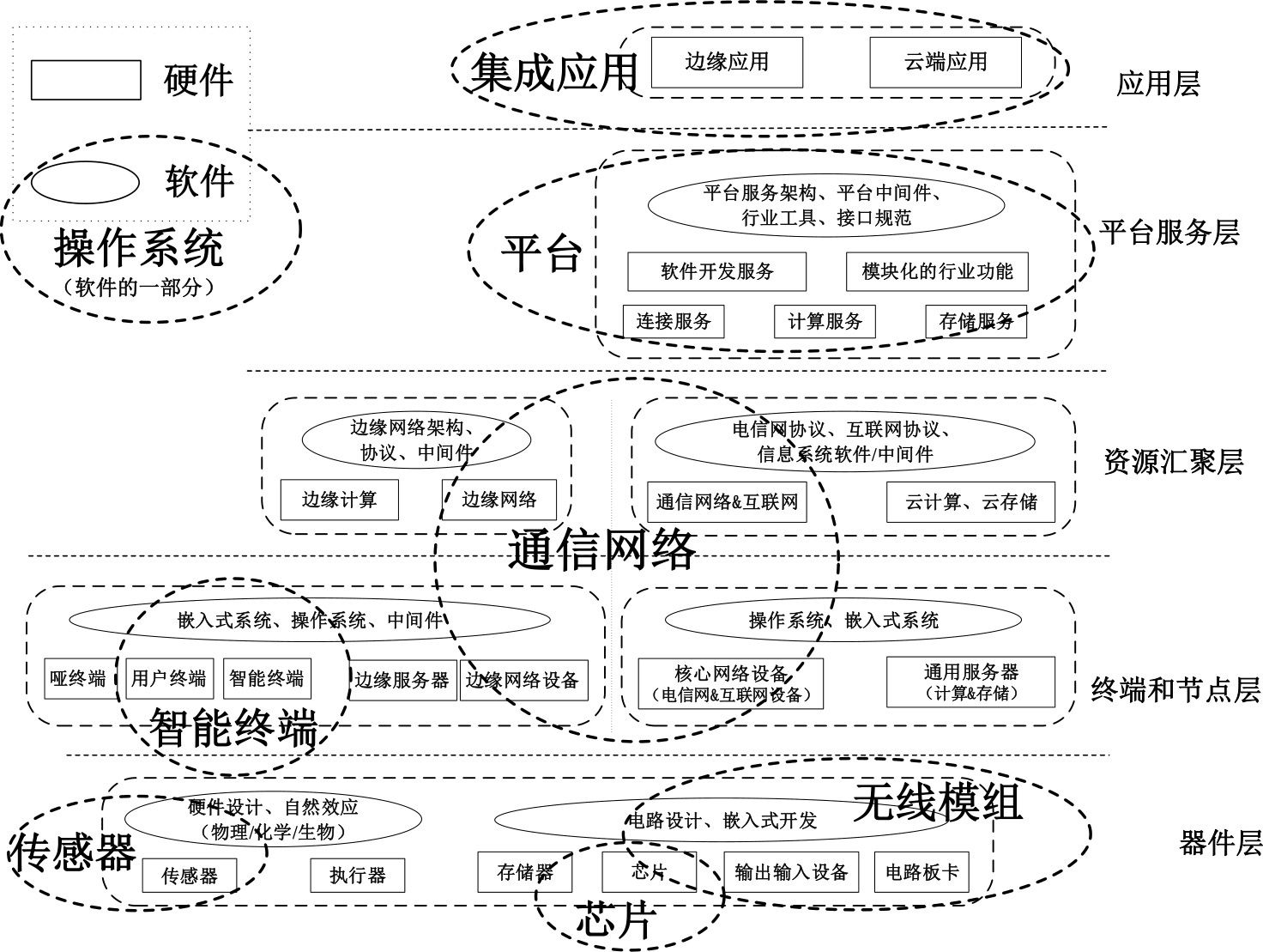 在终端和节点层、资源汇聚层中,两个域所包含的硬件和软件是有差别的。例如,边缘网络中有各类终端配备传感器——用以感知物理世界;但云端网络中的设备则只有标准的信号输出/输入接口。边缘网络会部署各种类型的网络协议,包括了有线网络和无线网络、“对等网络协议”和“非对等网络”(TCP/IP是一种对等网络协议,而RFID技术则是非对等网络协议);而“云端域”只有对等网络协议,例如IPv4、IPv6。