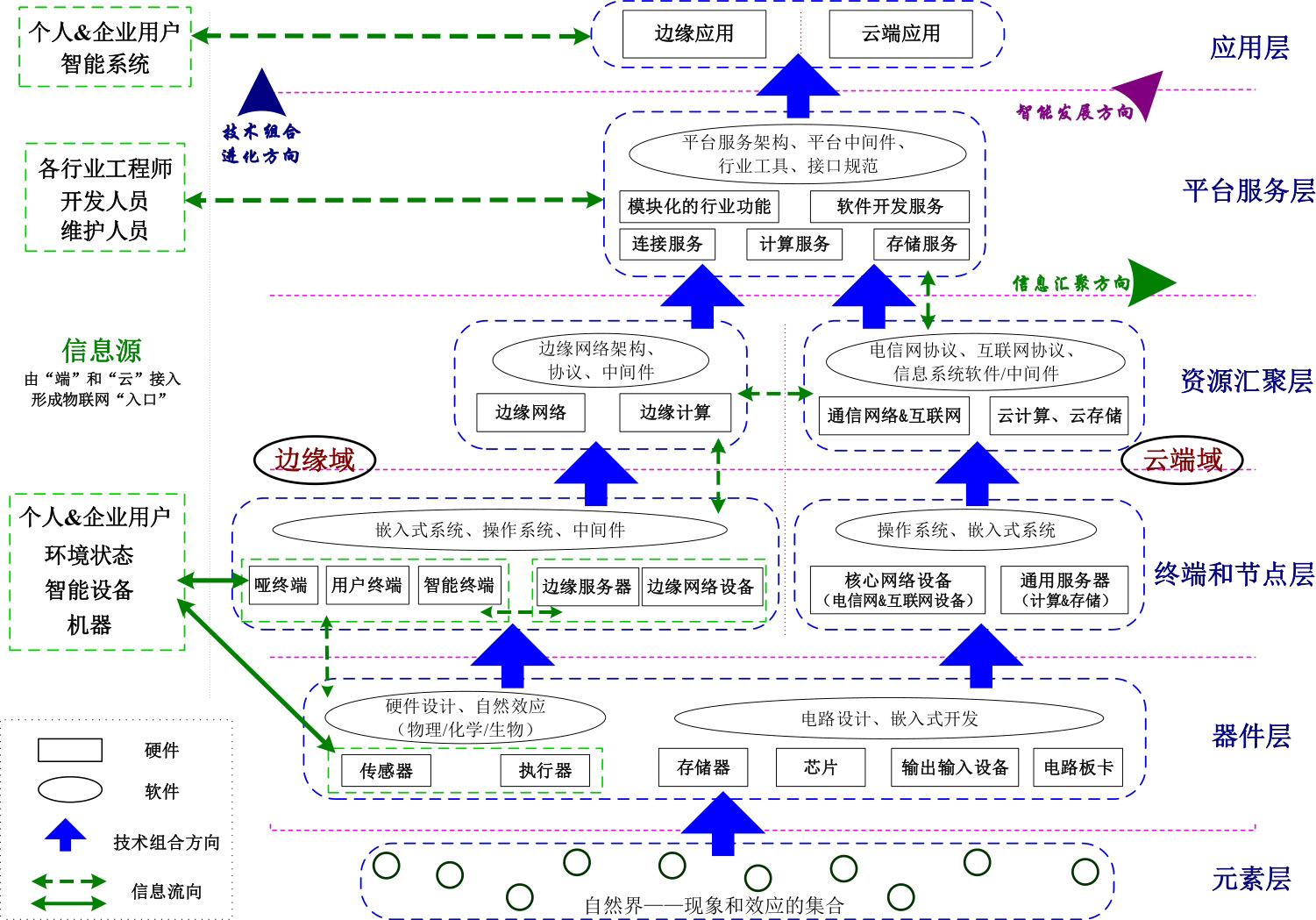 在物联网的技术矩阵中,根据技术自下而上的组合特性,自然形成了不同的层级,同一层级之中的技术一般都具有相似的复杂程度和功能特性。在底部是各类基础技术元素,是“提取自然现象中各种信息”和“向自然界反馈信息”的技术。基础技术元素不断组合汇聚并向上构建,实现更复杂的信息技术,直至各类智能化、自动化应用。整体上,高层级技术是低层级技术的有机组合,且又是更高级技术的一个部件。顶端的技术可以涵盖成千上万种基本技术元素,并有可能成为未来更高层技术的一个元素。