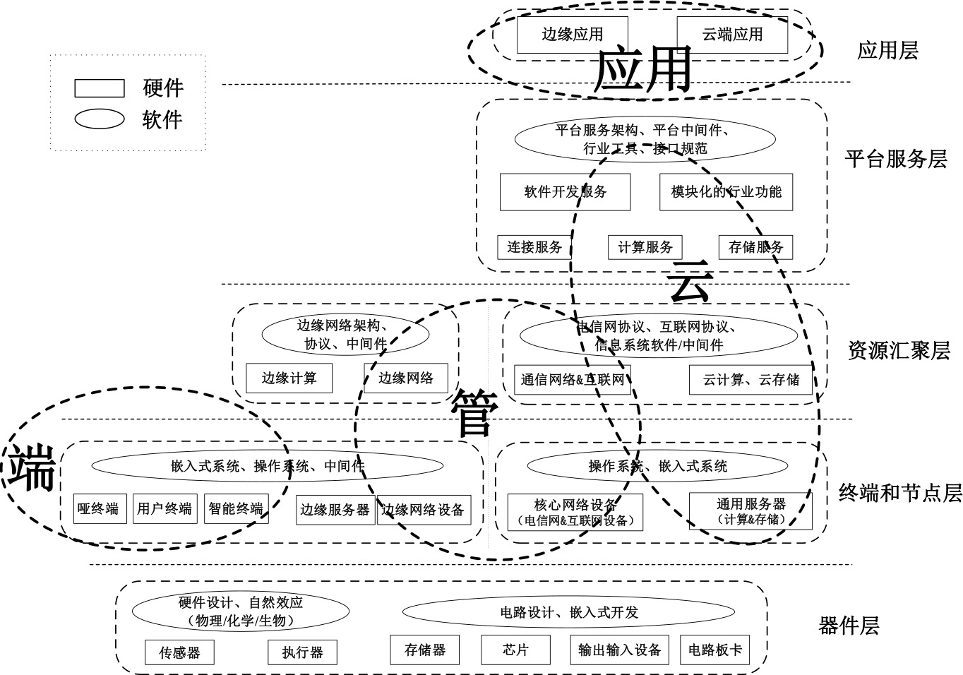 技术矩阵分成两个“域”:“边缘域”“云端域”。两个“域”的边界主要体现在终端和节点层、资源汇聚层、应用层,如图3-3所示。