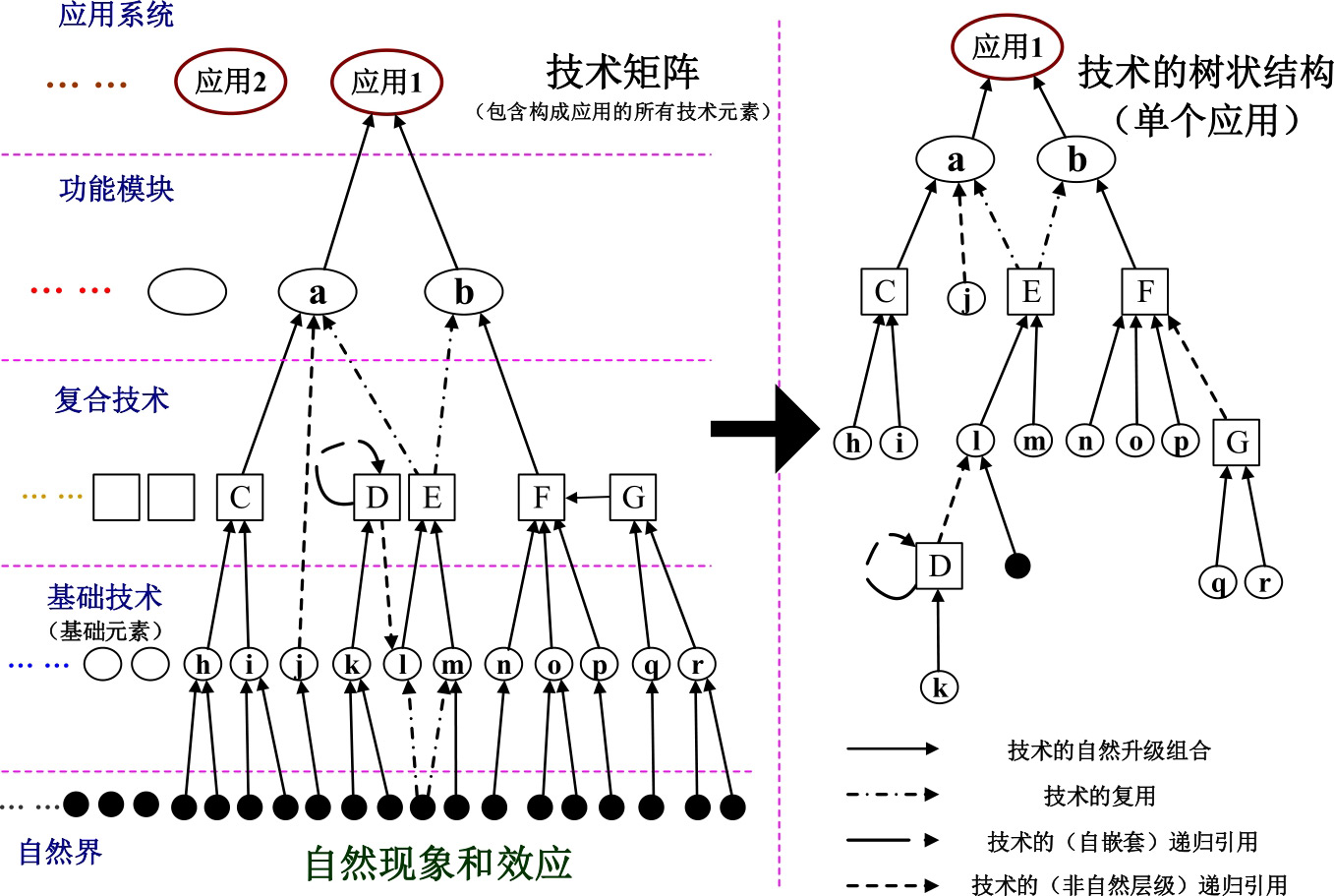 《技术的本质》一书中讲到,任何技术都是自然现象和效应(基本技术元素)的有目标的组合,这种组合并不是将所有技术元素随意地混杂、揉捏在一起,而是层次化且有序地组合它们。可以简单地分解成三层结构:底层,基本技术元素利用自然现象和效应实现基本、简单的功能;中间层,复合型技术将基本技术元素再行组合,形成更为复杂的功能;上层,复合型技术作为技术元素,进一步进行系统化组合,最终形成产品或应用。