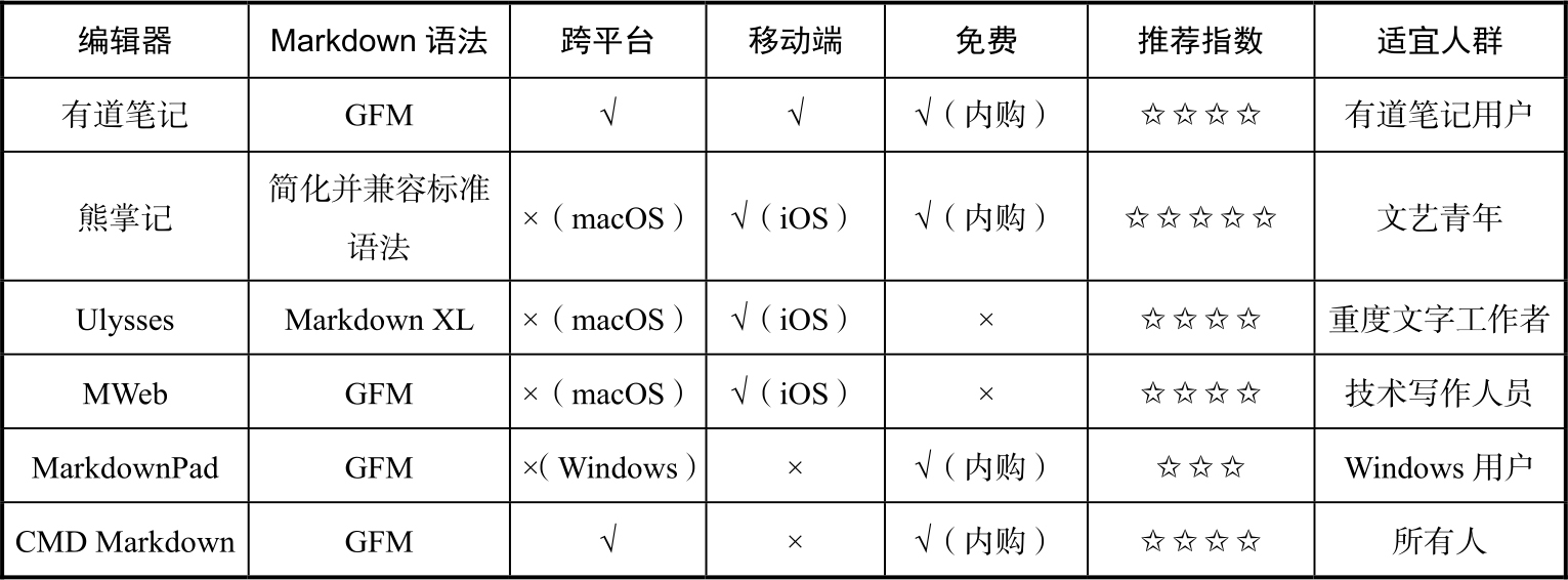 正所谓“好马配好鞍”,好的编辑工具可以让写作事半功倍。在市面上也有很多流行的Markdown编辑器,免费的、收费的都有,可谓各有千秋。本书精心挑选了一些比较有代表性的工具,会在后续的章节中为大家详细介绍。