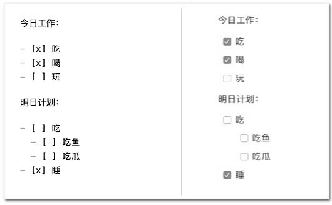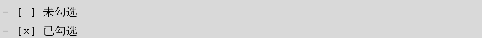 1)任务列表以-+空格 开头,由 [+空格/x+] 组成。