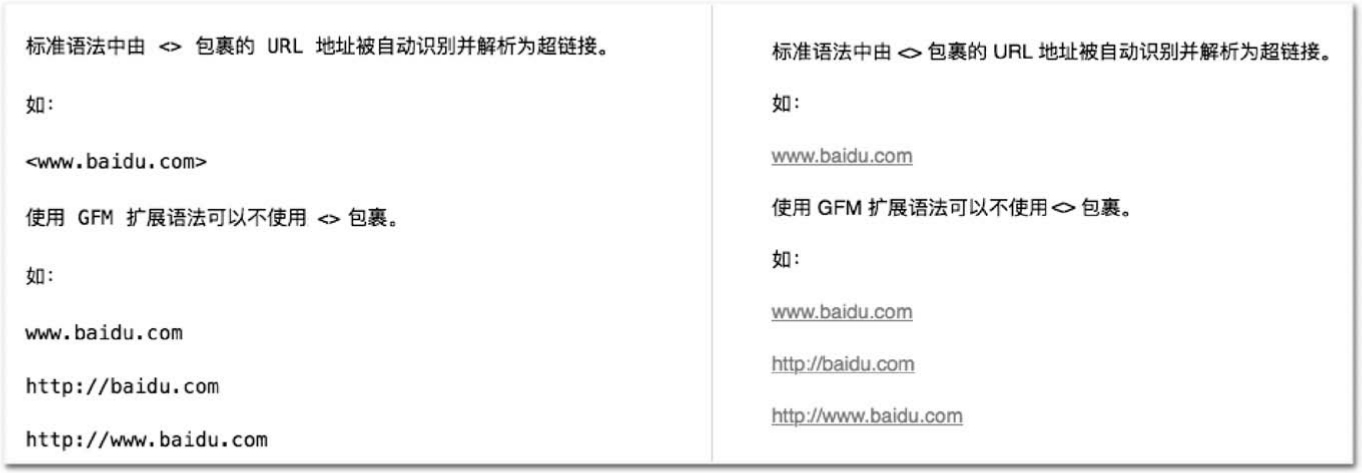 在标准语法中,由<>包裹的URL地址被自动识别并解析为超链接,使用GFM扩展语法则可以不使用<>包裹。