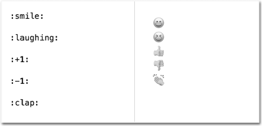 更多的表情符号请参考http://www.webpagefx.com/tools/emoji-cheat-sheet/。