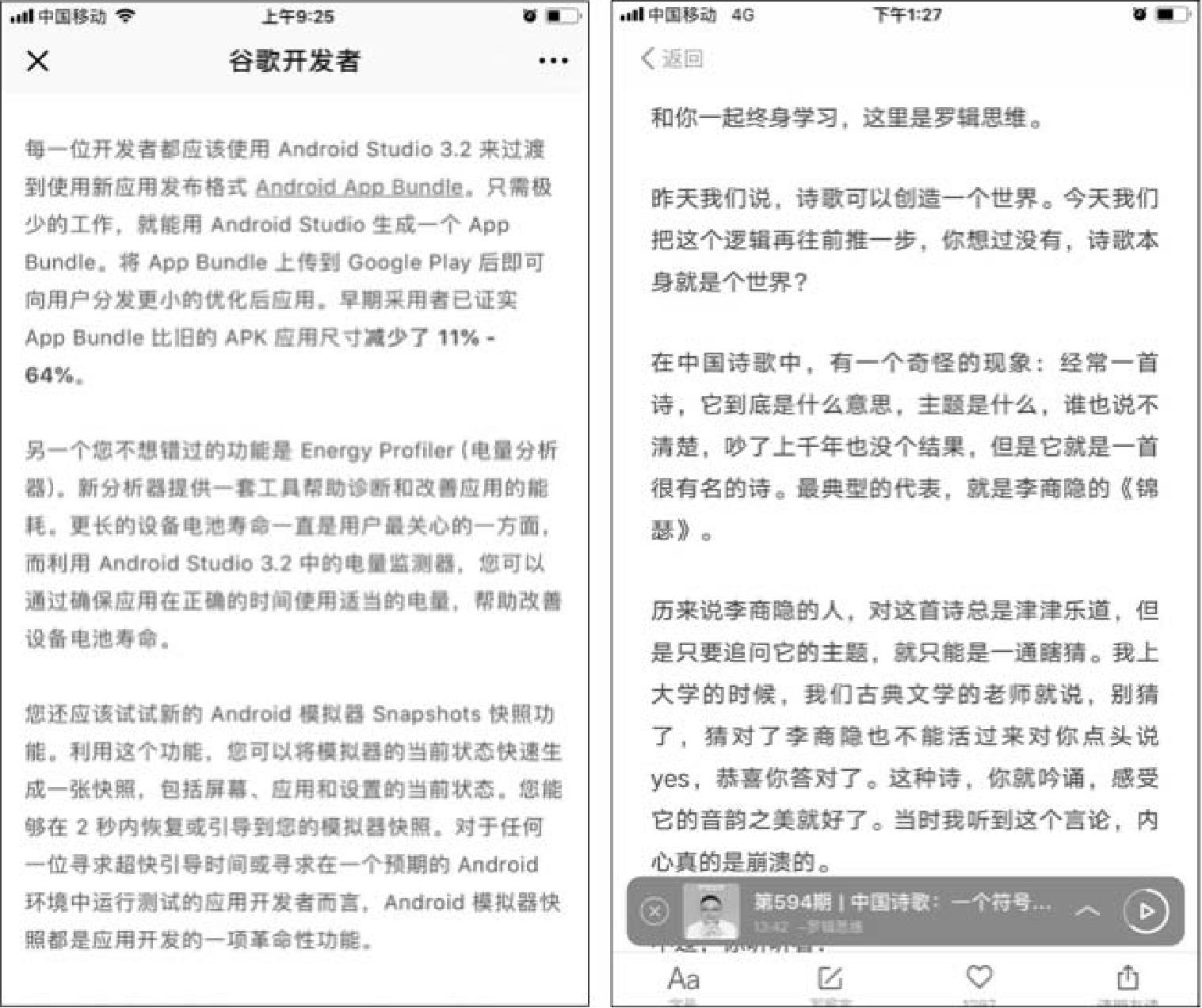如下图所示,左图是受关注比较多的技术公众号“谷歌开发者”的版面,右图是付费学习平台“得到”的版面。