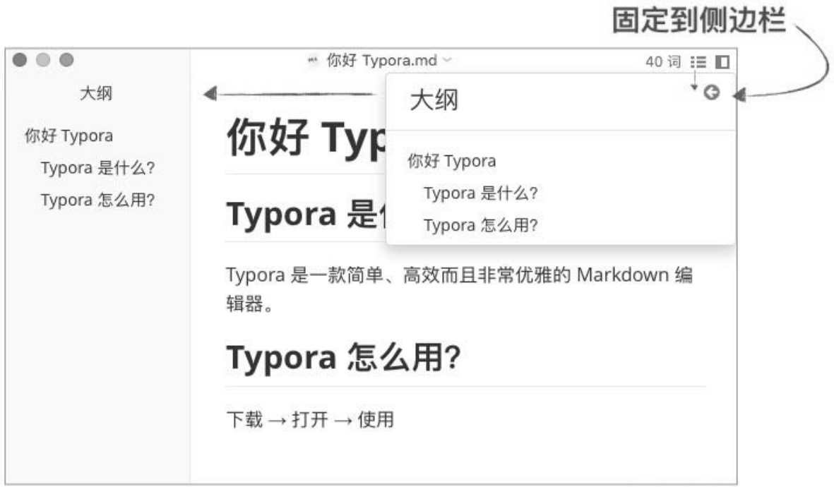 把鼠标放到状态栏上,在右上角会显示【大纲】图标,单击该图标会显示大纲悬浮面板,这个面板可以被固定在侧边栏。
