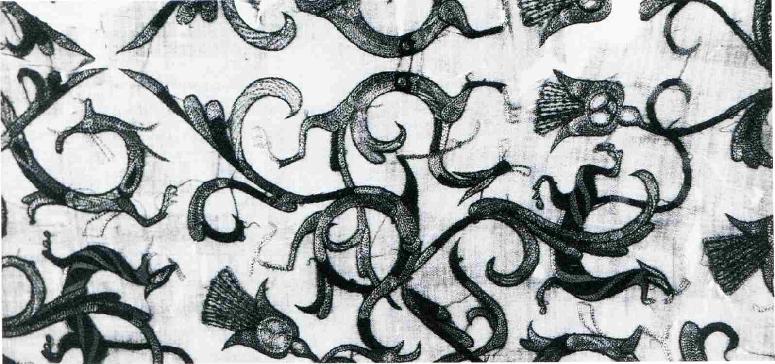 图6 刺绣寿衣局部,约公元前300年,湖北省马山。刺绣采用链形缝法缝制,有复杂的编织图案,是马山出土物中大量纺织品工艺品的代表。