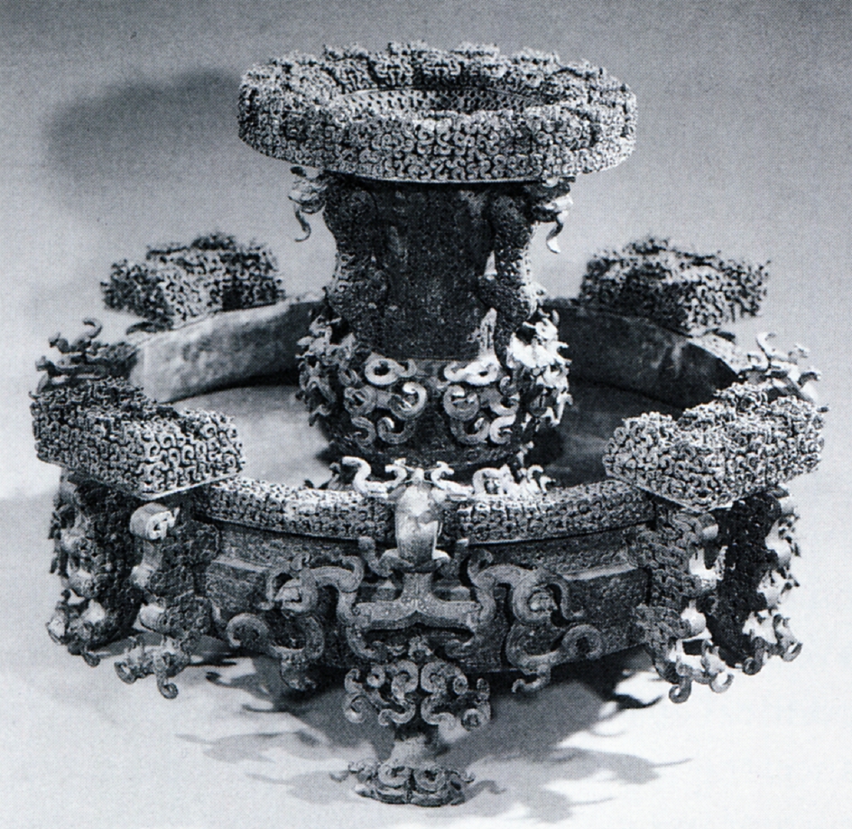 如果进入流通市场的金属容器在数量上确实有增加,有必要呼吁关注此时期的青铜器;它们必须格外巨大(侯乙墓中最大的一件高126厘米,金属重327. 5公斤),或者不得不借助其他手段,诸如镶嵌铜、金、银线或者其他珍贵金属,因为青铜器自身的意义已经经历了转变。现在这种材质的器物不得不与色彩丰富的漆器和丝织品竞争,正如重要遗址中引人注目的陪葬器物。在墓室中发现的被称为鼎的三脚容器,仍然是为了满足祭祀活动的需要,现在是相当地朴素和平淡。而在明确的非宗教活动中使用时,例如宴饮或者陈列,器物就被繁缛地装饰起来。