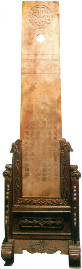 这很容易和“中国人好古”(the Chinese love of antiquity)联系起来,它描绘了一些人以某种方式沉浸于阐释他们自己长久而辉煌的过去,把过去想像成完整一体的,其他文明不能与之匹敌。我更想强调这件古代作品(实际上比题字的帝王所确定的年代更为古老)的创造性挪用,它插入到一个实际的新语境中,也就是皇家藏品中。而且皇帝声称的正统性是通过使用权力的古代象征物来实现,在这点上与许多其他的文化系使用有威望的建筑形制、艺术作品或收集以往的财宝去支持眼前计划的行为并没有根本的不同。实际上玉圭出现在本书中作为“中国艺术”的一个实例,它所在的台北故宫博物院同样表现了玉圭铭文装饰的新语境、新含义,想必与乾隆皇帝富有想像力的流露一样。我们可以尝试阐释这件作品最初是怎样被构想的,但是无从了解它“真正的意义”。