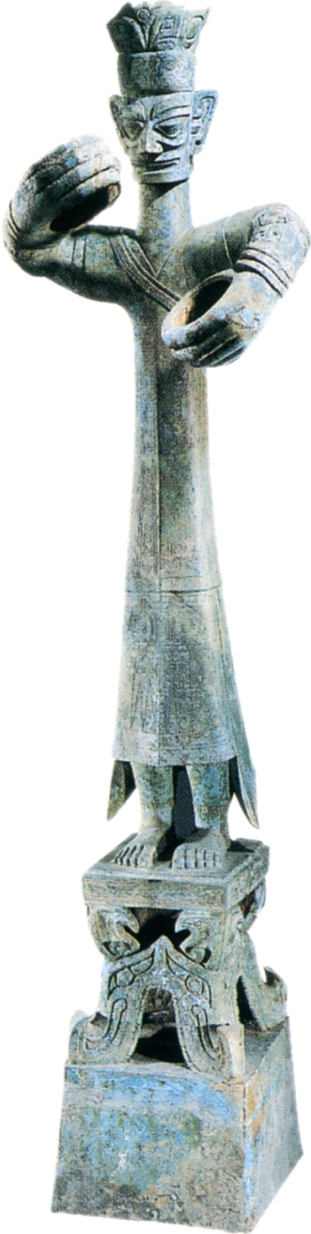 图2 三星堆青铜立人像,尺寸大于真人,公元前1200年。1986年发掘出土,在祭祀坑里铜像可能被故意打破、倾倒在地,坑里有祭祀动物的遗骨。