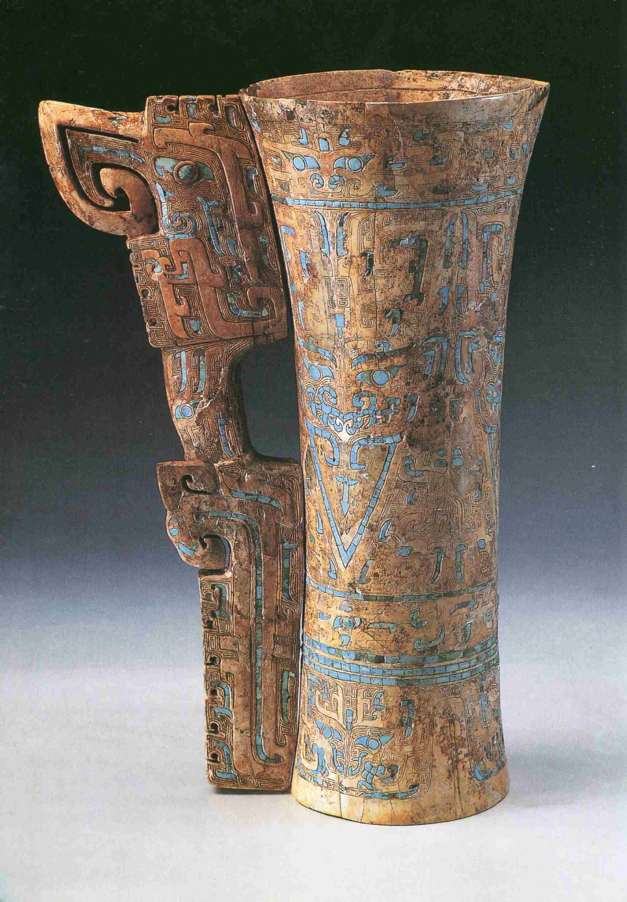图3 镶嵌绿松石象牙杯,商代妇好墓出土,公元前1200年。和其他个人物品一起放置在盒子中,直接放在棺椁上,可能是日常使用的珍品,和在祭祀典礼上使用的青铜器不同。