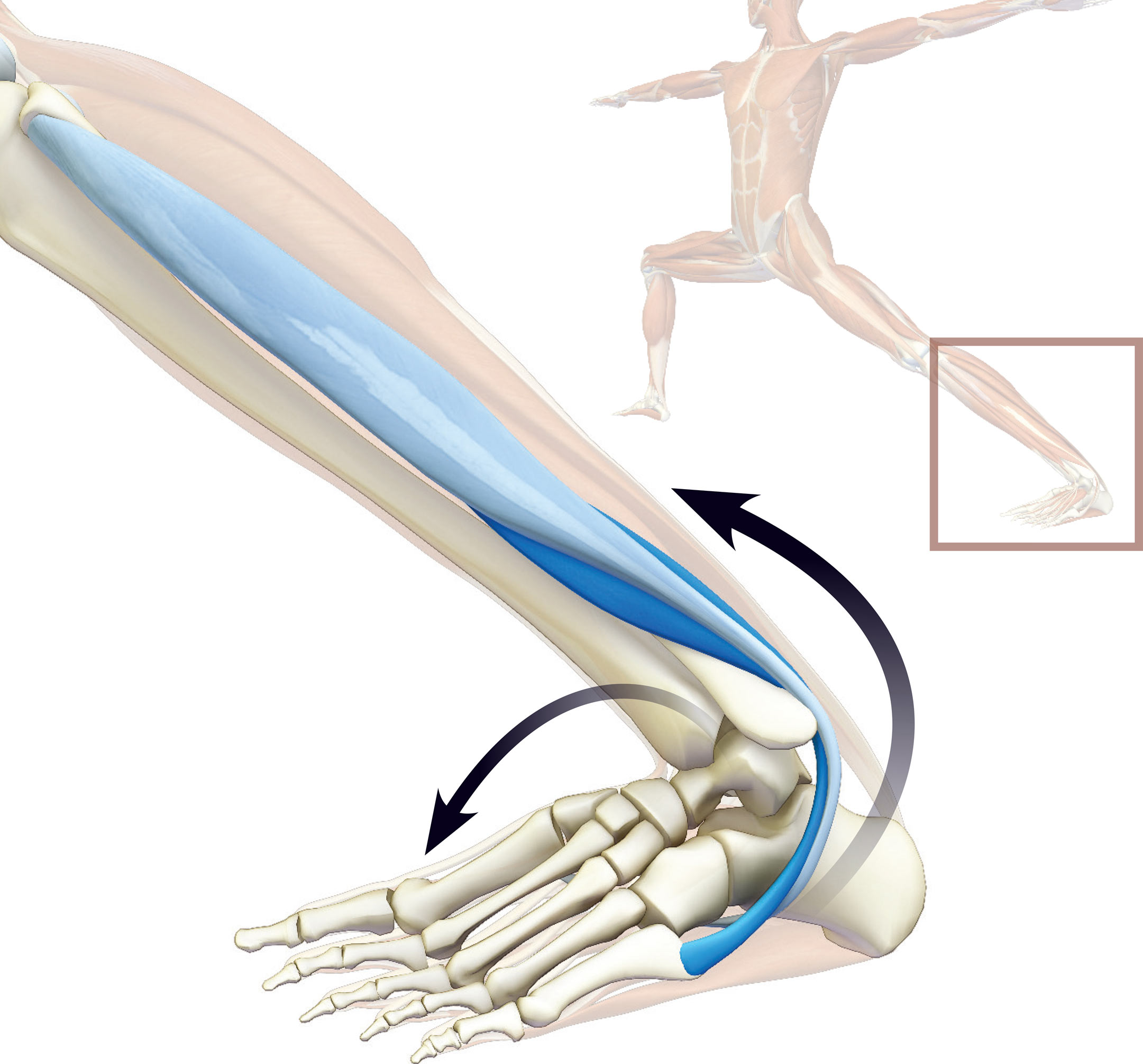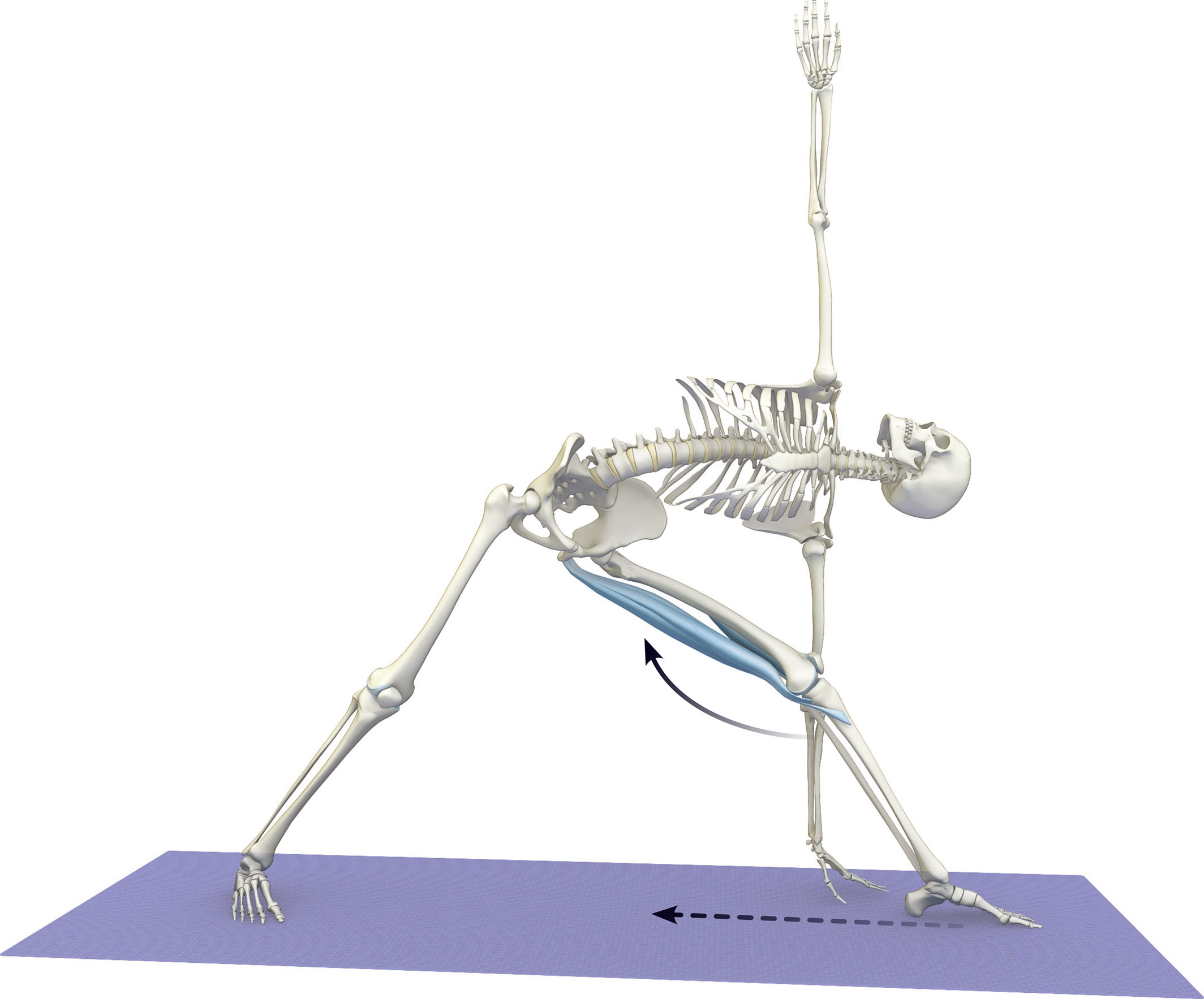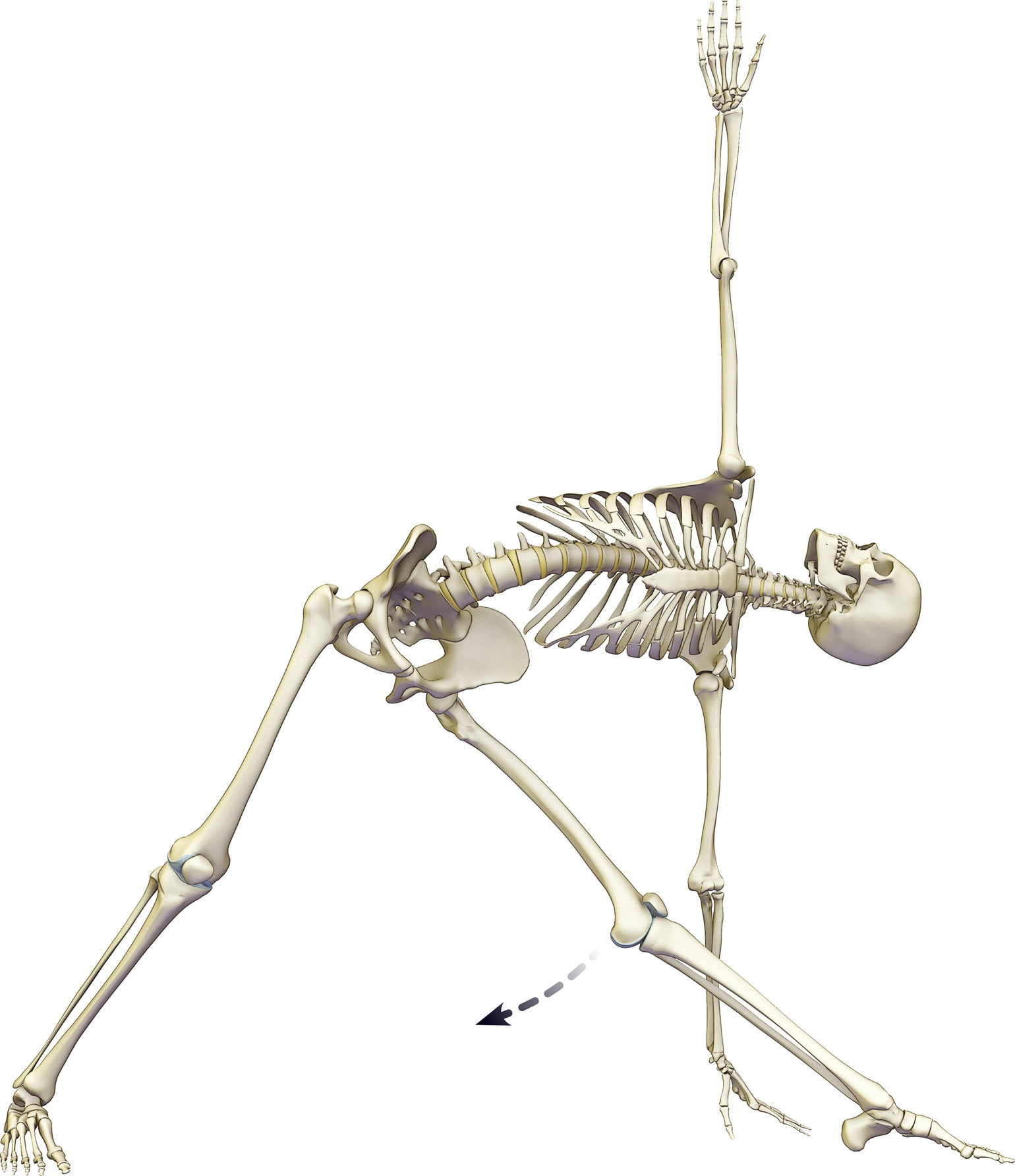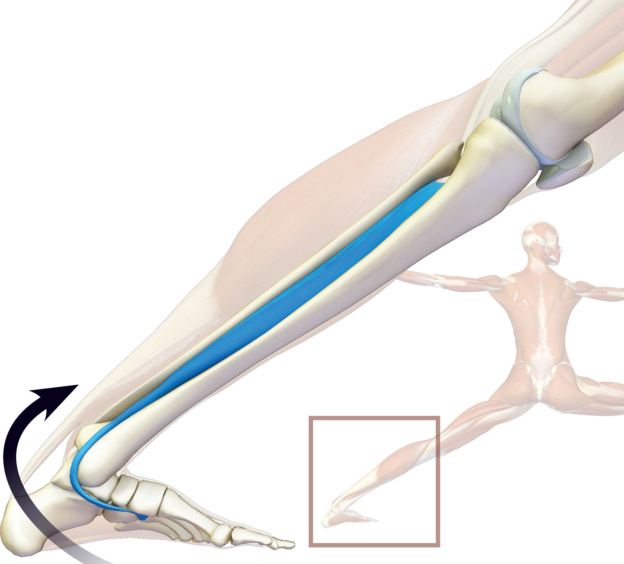 图五 练习站姿体式的时候,练习者的足部和踝关节连接练习者与地面。要善于运用肌肉共同激活,以稳定这一身体的基础。将足部向内转,收缩胫骨后肌提起足弓。该肌肉连接下肢的两块骨头(胫骨和腓骨),可稳定踝关节。首先,激活胫骨后肌,然后启动拮抗肌腓骨长肌和腓骨短肌(位于下肢外侧)。将跖球压向垫子,就能感受到腓骨肌的收缩。感受下这组主动肌和拮抗肌群如何通过共同收缩来稳定下肢、踝关节和足部。