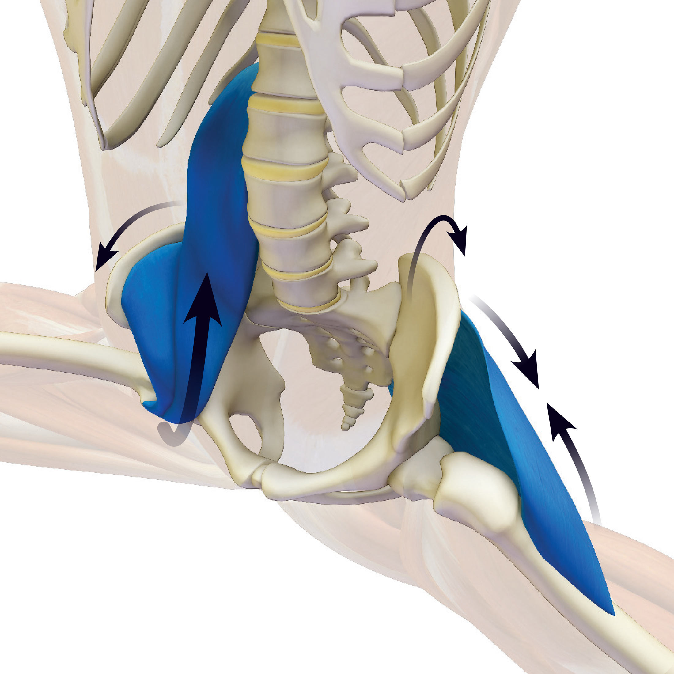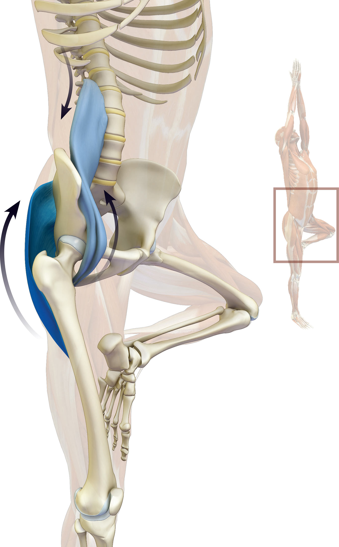 图六 单腿站立的体式中,共同激活腰肌和臀大肌,可以从前到后稳定骨盆。在练习中,在脑海中观想自己正在收缩这两大肌肉。