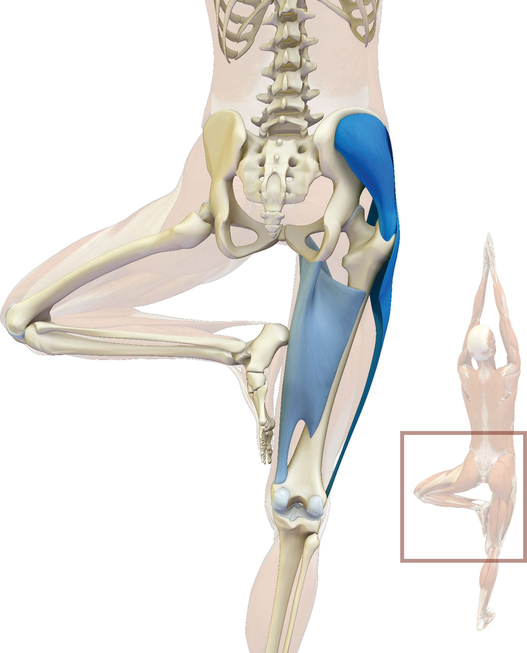 图七 在像树式这样单腿站立的体式中,我们会自动应用共同激活。臀中肌和阔筋膜张肌是外展肌,一般用于让髋关节远离中线。然而,当我们单腿站立时,臀中肌和阔筋膜张肌会将骨盆的髂骨往下拉。如果这两块肌肉不启动,骨盆会转向站立腿一侧,进行该体式的人就会失去平衡。在进行树式时,将一只手放在髋部的外侧,你可以感到阔筋膜张肌和臀中肌收缩。另外,大腿内侧的内收肌也会共同收缩,进一步稳定骨盆和髋部。进行该体式时,观想这些肌肉。