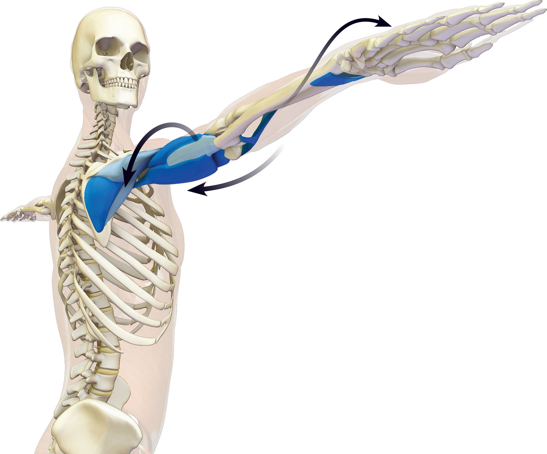 图三 共同激活原则还可用于稳定肩膀和手臂。手掌向下,这个动作使前臂内旋,启动了旋前圆肌和旋前方肌。接着,肩膀向外旋,借此激活肩袖肌群的冈下肌和小圆肌。最后,收缩肱三头肌,伸直肘关节。这些动作将前臂内旋和肩膀外旋结合起来,造成肘部的扭转效果,使肘部韧带拉紧,并能稳定关节。这使整条手臂从上到下形成了一个螺旋状结构。