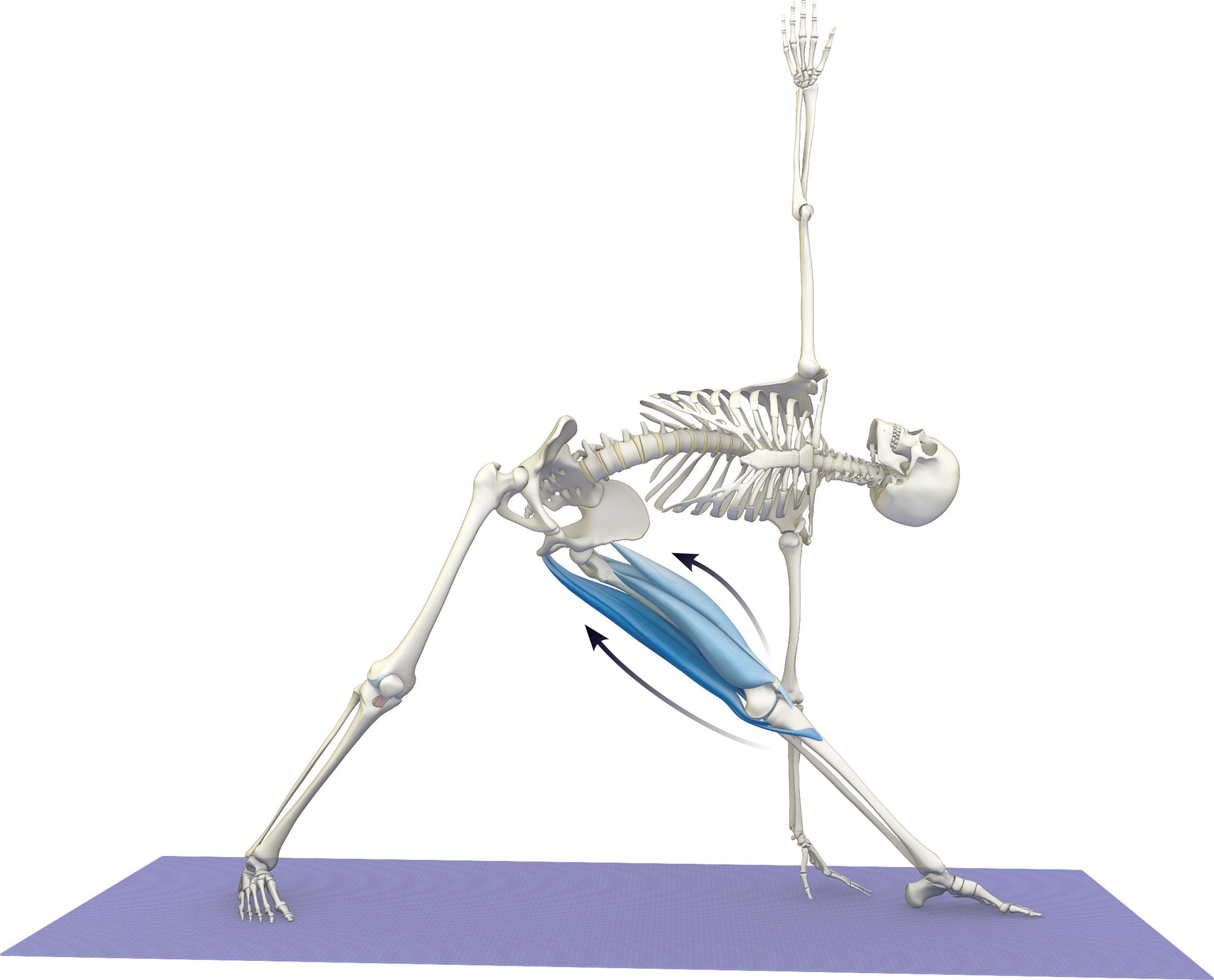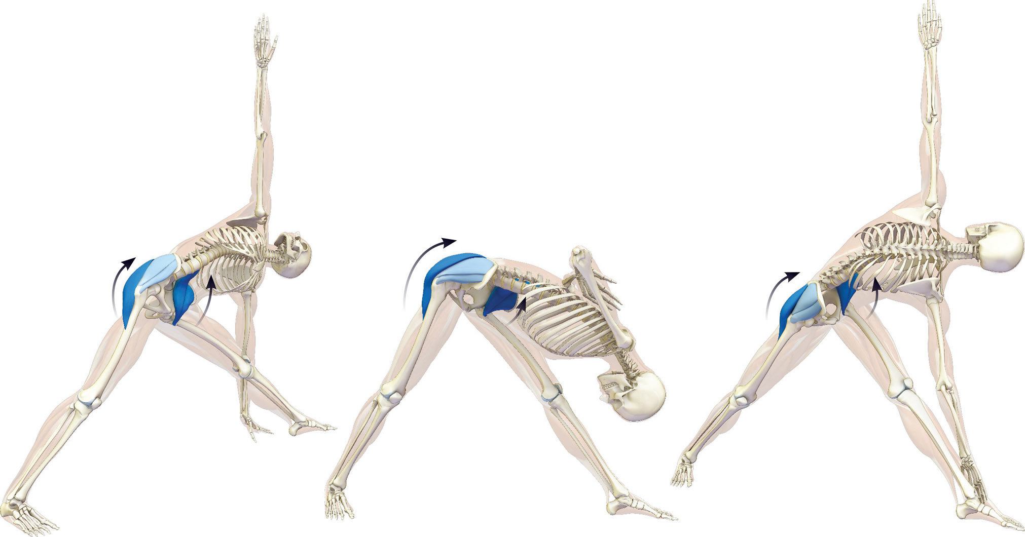 图二 这三张图展现了运用一系列逐步转动骨盆的站姿体式同时激活腰肌和臀大肌的动态过程。练习者可以用这种方式将体式串联起来,以唤醒对这两块核心肌肉的有意识控制,特别是对腰肌的控制。这种新建立起来的有意识控制可以允许练习者在其他体式中也直接收缩这两块肌肉,使躯干弯曲更深入,提高稳定性。