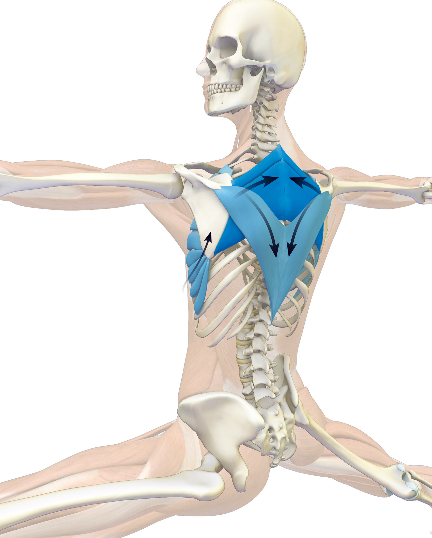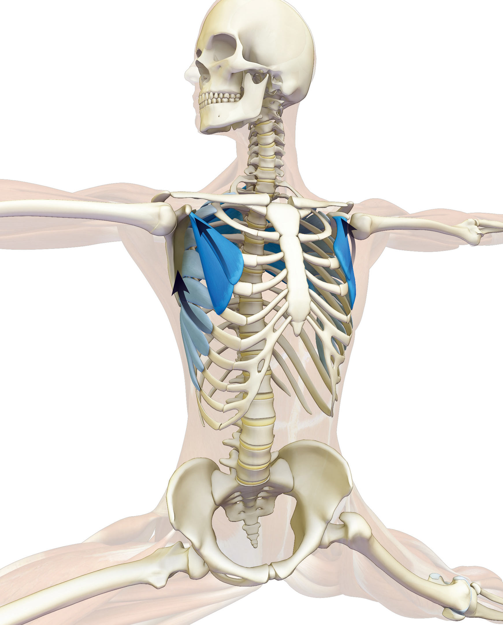 图四 练习者可以共同激活呼吸辅助肌,以扩张胸腔,打开胸部,增加肺通气量。首先,收缩菱形肌,使肩胛骨收向脊柱。这有助于稳定肩胛骨,同时扩胸。保持这一姿势,然后收缩胸小肌。练习者可以通过尝试把肩膀向前绕找到这块肌肉。菱形肌和中斜方肌将肩胛骨拉向身体中线,并稳定肩胛骨。胸小肌收缩的力就传到其位于胸腔的起端,并将胸腔提起。下斜方肌将肩膀向后下方拉动。激活前锯肌可以再进一步扩张胸腔。练习者会发现自己的呼吸更深了。