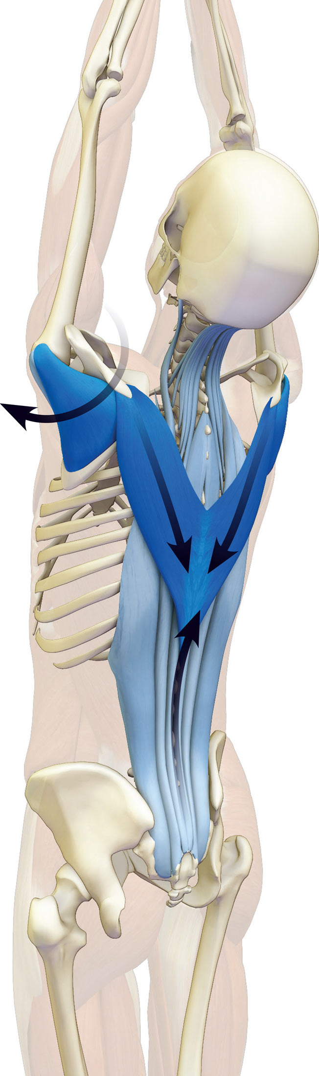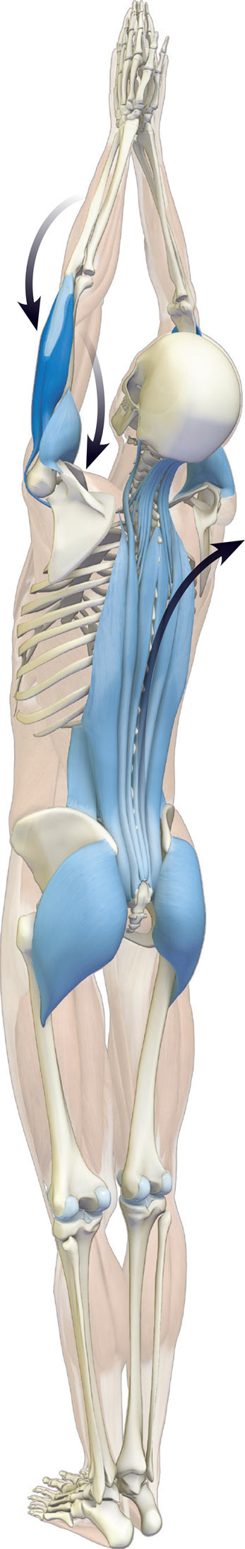 图二 接下来,收缩臀大肌、竖脊肌和腰方肌,使背部上提,并微微后挺。启动三角肌前束,抬高手臂。做该动作时,练习者可以感受到肩膀前部这些肌肉收缩。收缩肱三头肌,伸直肘关节。三头肌的长头也会旋转肩胛骨。激活该肌肉,练习者可以把手臂抬得更高。