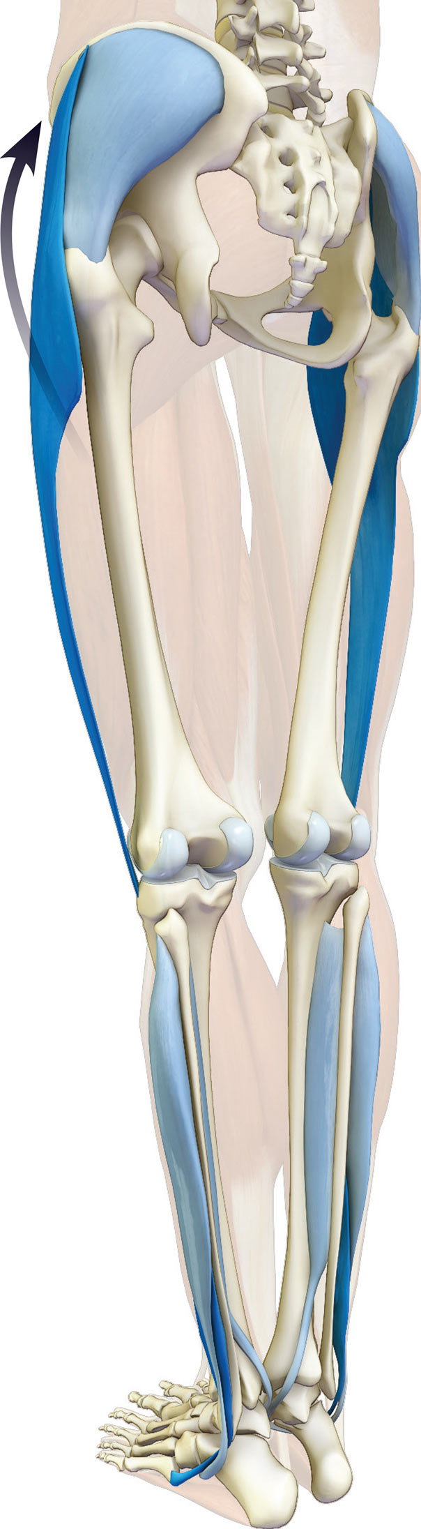 图四 收缩小腿外侧的腓骨长肌和腓骨短肌,将跖球压向瑜伽垫。然后尝试将脚底向两侧拉,但是由于瑜伽垫的摩擦力,两脚并不会动。但是向外打开腿的努力会激活阔筋膜张肌和臀中肌。这些负责使大腿向内旋转的肌肉,会使股骨向内,并使膝盖骨朝前。