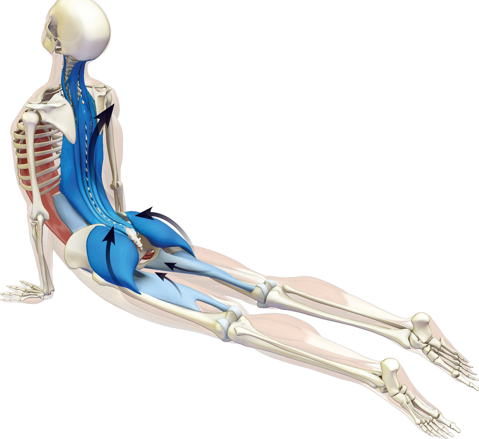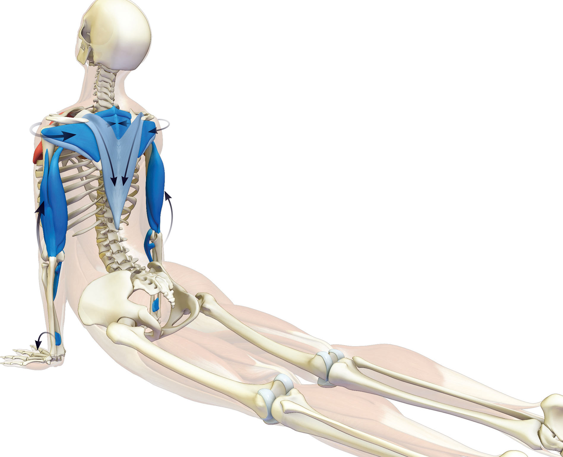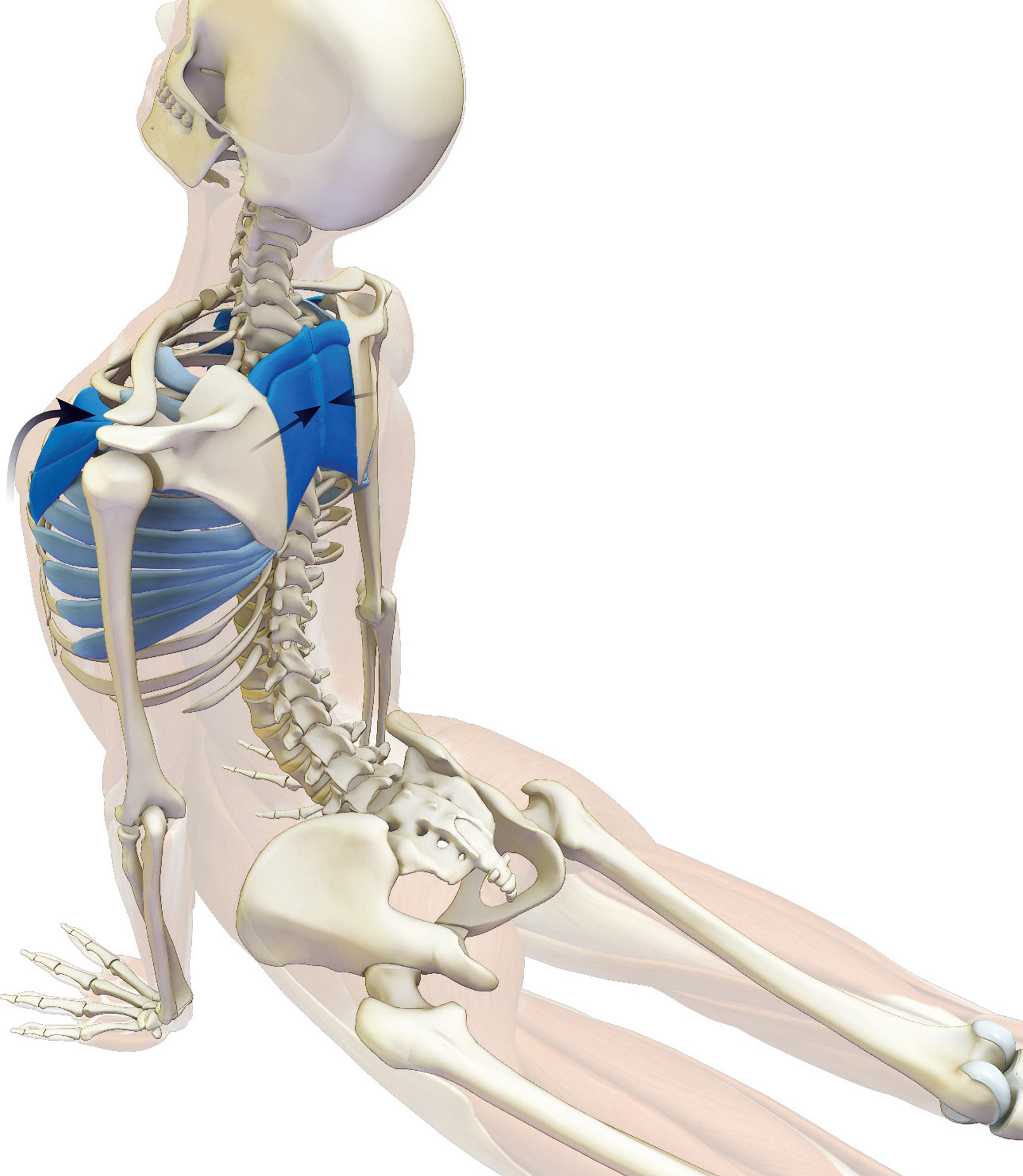 图四 最后,使用呼吸辅助肌以扩胸。启动菱形肌保持肩胛骨不动。然后收缩胸小肌,向上拉提胸腔,并启动前锯肌使胸腔向外扩展。进入上犬式时,呼吸要深,这些肌肉可以帮助你做到。