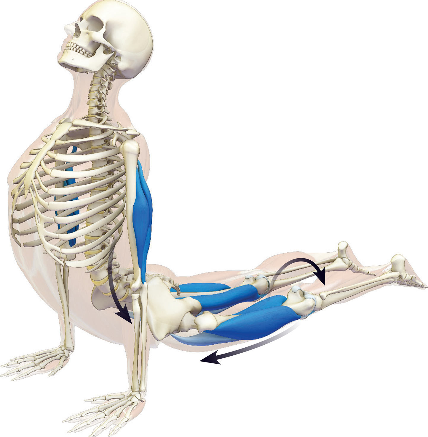 图一 收缩肱三头肌和股四头肌,以伸直肘关节和膝关节,进入上犬式的大体姿势。