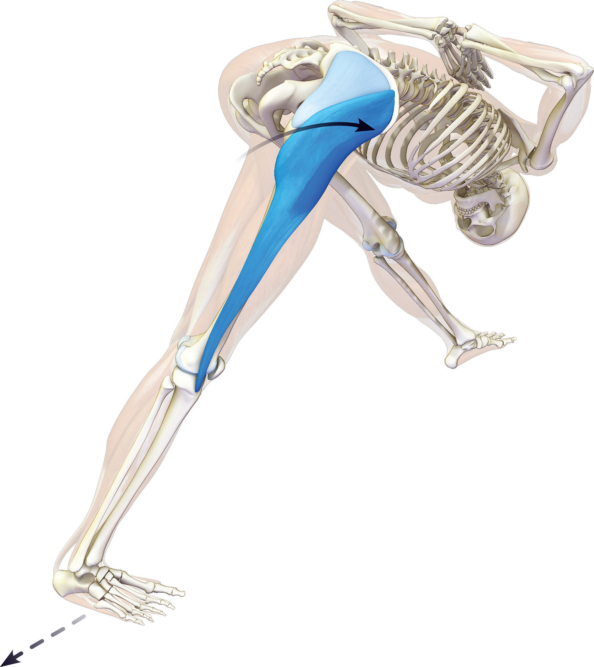 图三 在加强侧伸展式中,臀中肌和阔筋膜张肌使后侧腿从髋关节处外展、内旋。同时,阔筋膜张肌还协助股四头肌伸直膝关节。在瑜伽垫上尝试使后脚拖着或摩擦着远离前脚。你会感觉该肌肉在髋关节侧面收缩,打开了膝关节背面。
