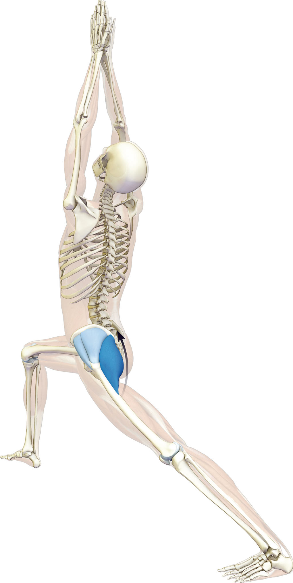 图一 在战士第一式中,臀肌伸展髋关节,并使骨盆向下、向后倾斜。启动臀肌的方法是收臀,夹尾骨。