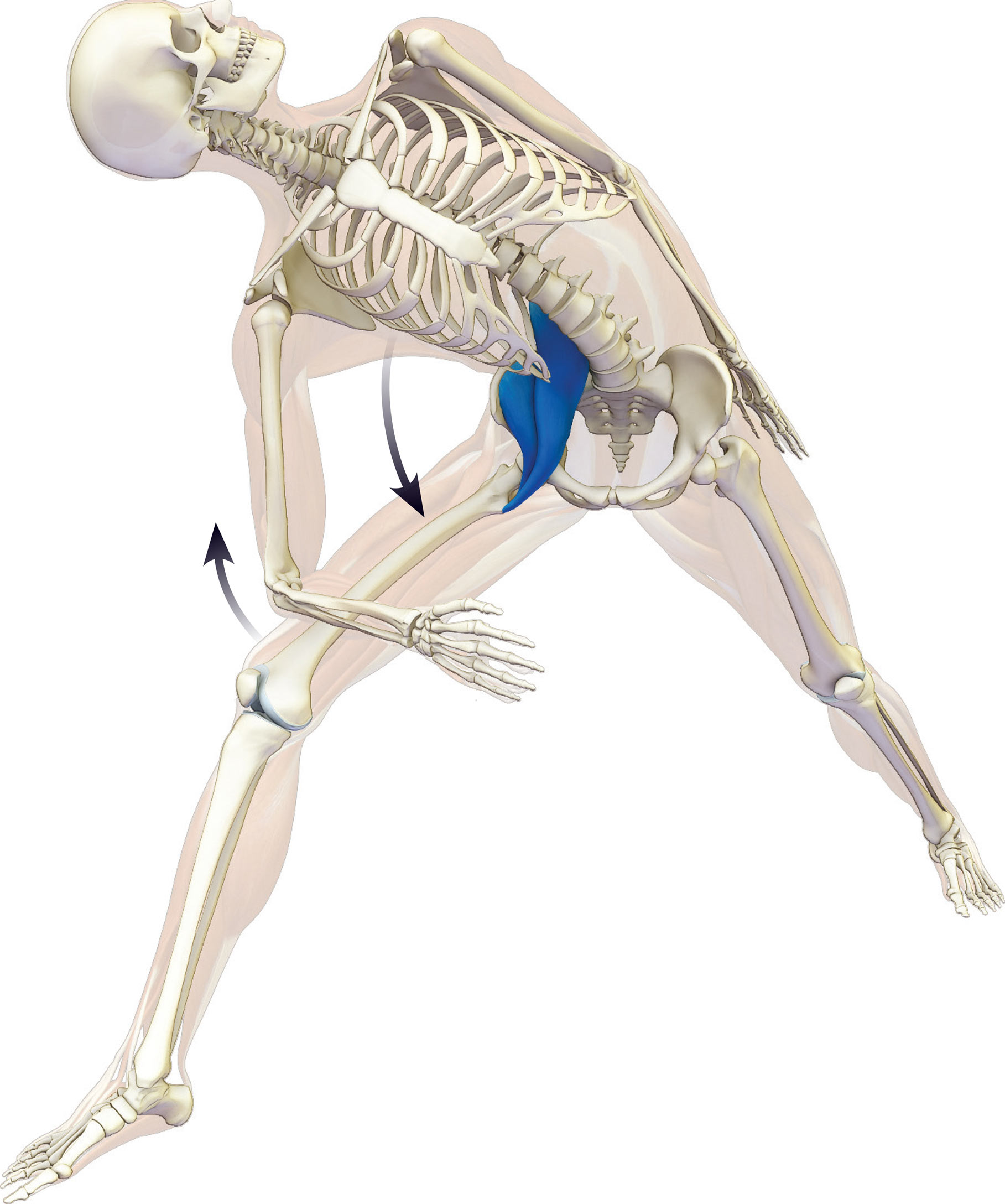 图二 在三角侧伸展式中,腰肌弯曲躯干和髋关节。想要体会到腰肌在骨盆的单独收缩,可将手肘放在大腿上,借助躯干的力量往下压,同时,试着提腿以对抗肘部动作。在所有屈曲髋关节的动作中都会用到腰肌,以便从核心稳定身体。