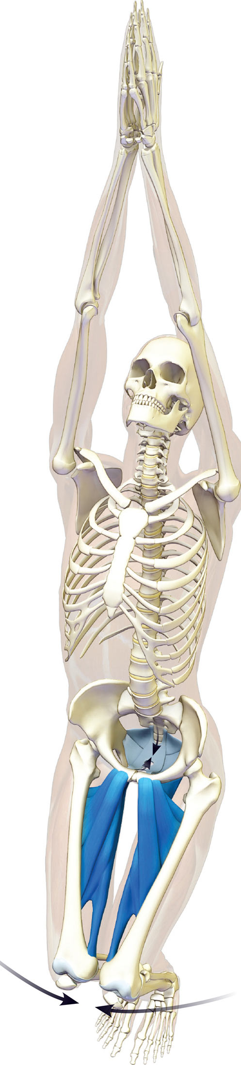 在练习体式时,肌肉控制关节位置,并调整骨骼进入正位。虽然我们可以利用重力和其他力量做出体式的大致形态,但是激活一定肌肉可以提高动作准确性。原动肌是产生主要关节活动的肌肉。通过分离出关节的原动肌可以雕琢体式。下面是在站姿体式中如何启动关键肌肉的指导。你还可以使用观想法(visualization),观看本书图片,在脑海中想象这块单一的肌肉正在启动。