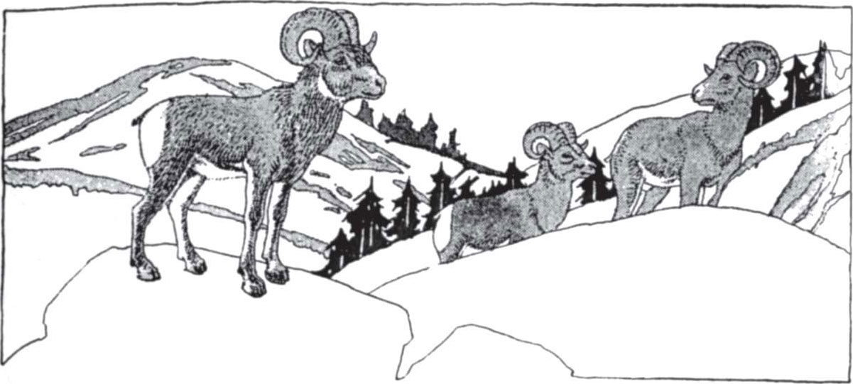 The chill breath which comes before dawn awakened me. It was still and dark. Through the gloom I could distinctly make out the loom of the old horse, lying down. I was speedily ready, and groped and stumbled slowly up the hill, and then along its crest to a peak. Here I sat down and waited a quarter of an hour or so, until gray appeared in the east,and the dim light-streaks enabled me to walk farther. Before sunrise I was two miles from camp; then I crawled cautiously to a high ridge and,crouching behind it, scanned all the landscape eagerly. In a few minutes a so movement about a third of a mile to the right, midway down a hill,caught my eye. Another glance showed me three white specks moving along the hillside. They were the white rumps of three fine mountain sheep, on their way to drink at a little pool in the bottom of a deep,narrow valley. In a moment they went out of sight round a bend of the valley; and I rose and trotted briskly toward them, along the ridge. There were two or three deep gullies to cross, and a high shoulder over which to clamber; so I was out of breath when I reached the bend beyond which they had disappeared. Taking advantage of a scrawny sage brush as cover, I peeped over the edge, and at once saw the sheep—three big young rams. They had finished drinking and were standing beside the little miry pool, about three hundred yards distant. Slipping back, I dropped down into the bottom of the valley, where a narrow washout zigzagged from side to side, between straight walls of clay. The pool was in the upper end of this washout, under a cut bank.