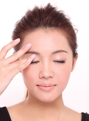 步骤1 在无名指指腹上沾上眼霜,从眼头上方的地方开始,慢慢以提拉的手势滑向眼窝。