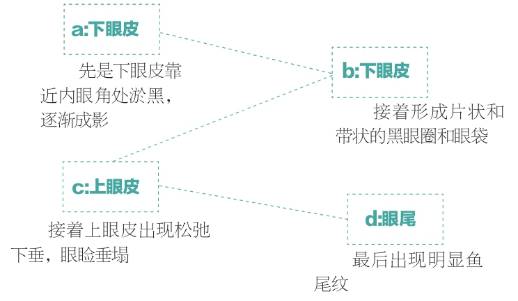 黑眼圈并不是一两次失眠就会导致的,它的成因最终还是眼部循环衰退。黑眼圈被视为眼部衰老第二个出现的迹象,眼周是由下到上,最后是外圈慢慢出现问题的,第一次警示就发生在下眼皮。因此,一定要预防眼部疲劳并尽早使用促进循环的眼部产品。当下眼皮开始出现浅影时,就要注意日常作息和针对黑眼圈的护理。