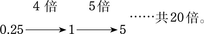 对比两种转化方式我们可以发现一个规律,即“除以分数相当于乘以它的倒数”。例如在计算5÷0.25时: