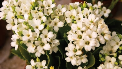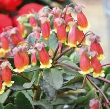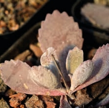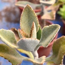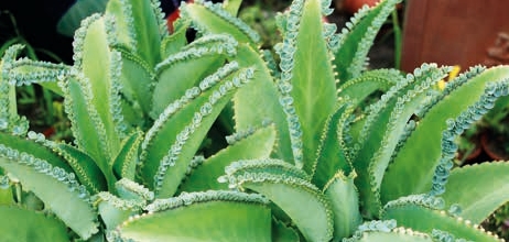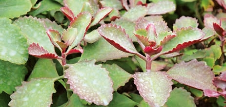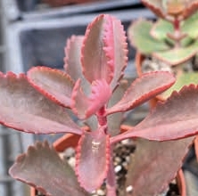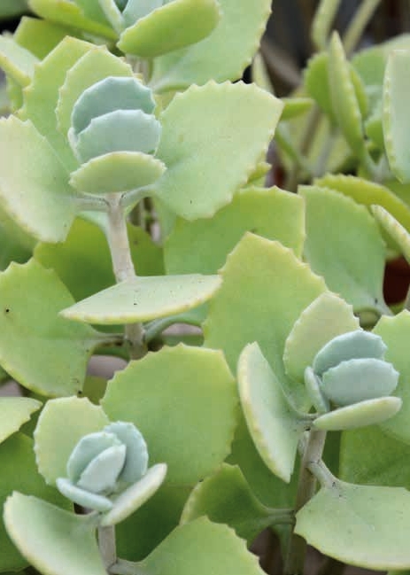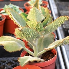 又叫落地生根,株高1米,株幅30厘米。叶片披针形,肉质,绿色,具淡红褐色斑点,边缘锯齿状,着生不定芽。聚伞状圆锥花序,花宽钟形,下垂,淡灰紫色,花期冬季。