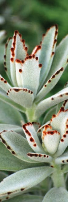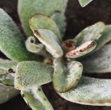 叶子短小厚实,叶片长圆形,被深褐色的斑点包围。毛茸茸的叶片摸起来很有触感。全株密被银色茸毛,叶上缘锯齿状,缺刻处有黑色斑。花钟状,黄绿色。