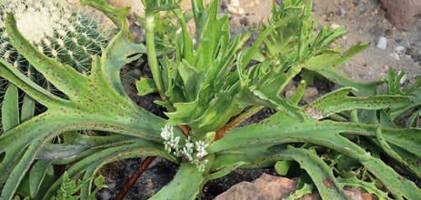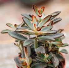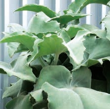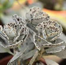 株高1米,株幅1米。叶片对生,广卵形至披针形,肉质,灰绿色至褐色,背面银灰色,叶面微凹,密被细毛,边缘具稀锯齿。圆锥花序,花坛状,黄绿色,花期冬末。
