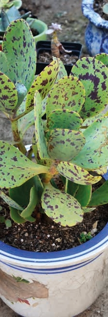 株高40厘米,株幅40厘米。叶片倒卵形,肉质,叶缘浅波状,叶面灰绿色,具有紫褐色斑点。花窄管状,直立,白色,也有粉红或黄晕,花期春季。