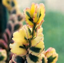 分枝密,最初匍匐,以后直立,叶交互对生,叶片肉质扁平,卵形边缘有齿,蓝色或灰绿色,上有不规则乳白红、黄色斑纹。 小花橙红色。