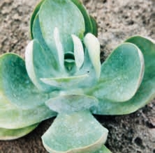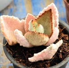 株高 15~20厘米,株幅30~40厘米。叶片倒卵圆形,肉质。中绿色,具白色粉状,叶缘有齿状物。花坛状,粉红色,花期春季。