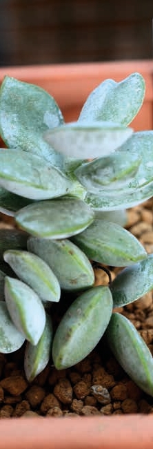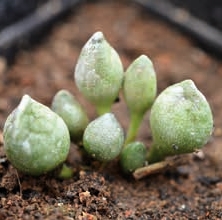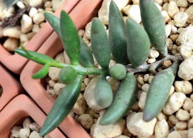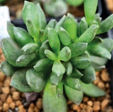 株高3~5厘米,株幅3~5厘米。叶片卵圆形,形似小鼓槌,绿色。夏季开花。喜充足阳光,光线强时,叶片紧凑,叶片上的颜色变深。