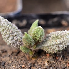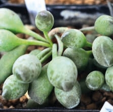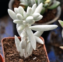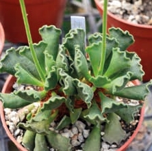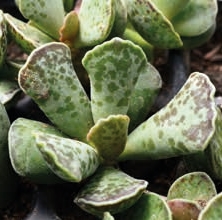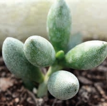 株高 10 厘米。茎半直立,有许多气生根。叶对生,椭圆形至扇形,肉质,上缘波状,表面灰绿色,密被细白毛,无斑点,花筒状,淡绿红色,长 1.5 厘米,花期夏季。