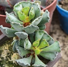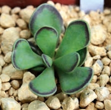 株高5~10厘米,株幅12厘米。御所锦的斑锦品种。叶片圆形或倒卵形,表面绿色,被白霜。夏季开花。为石莲花属的夏型种。浇水时切忌直接浇灌叶面。