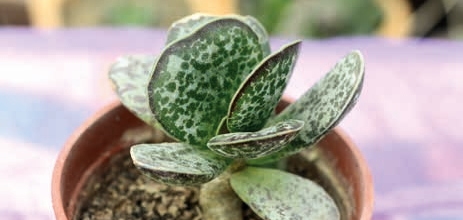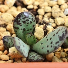 小型品种。叶片对生排列,长2~4厘米,叶无柄,但基部狭窄,先端扁尖,叶尖部分有凹陷,叶片梭形,叶面有坑坑洼洼细密的疣突,叶片密布紫红色大斑点。