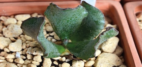株高7~10 厘米,株幅 8~12 厘米。叶片肉质,纺锤形,呈放射状生长,表面橄榄绿色,非常粗糙,表皮密布小疣突,形似苦瓜,有光泽。花钟形,绿色,花期夏季。