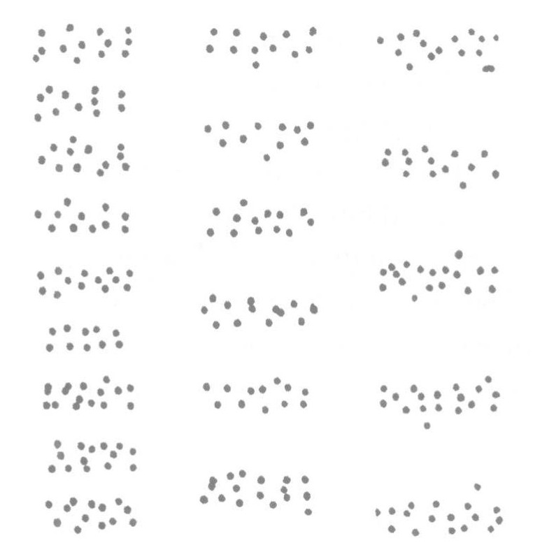 现在用一套新的盒子对重复此过程。这次每对盒子之间的间距不同于上一轮。你会发现原子集群的间距也不同。两个盒子之间的间距越大,则两群原子之间的距离就越小,如图7.5所示。每个原子均遵循一条由盒子对间距决定的规则。因此每个原子都“知道”其盒子对的间距。