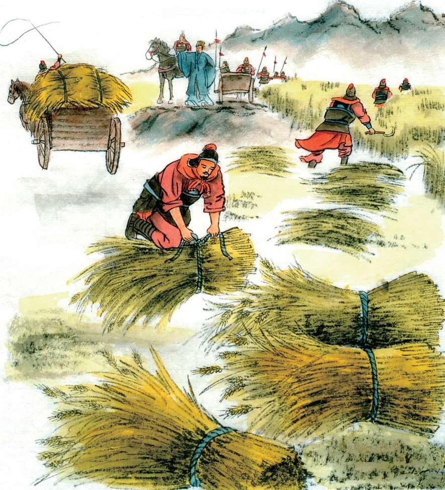 趁此机会,诸葛亮命令手下三万精兵手执镰刀、驮绳,抢在司马懿大军到来之前,把陇上的新麦全都收割了,然后运到卤城打晒。