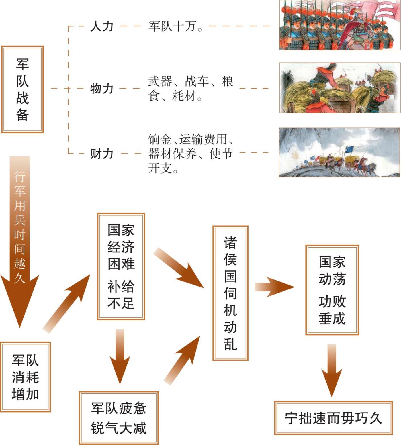 国家会因用兵而招致贫困。因此善于用兵的人,就会尽量缩短出征的时日,减少战争的损耗,保留实力,稳定国情。